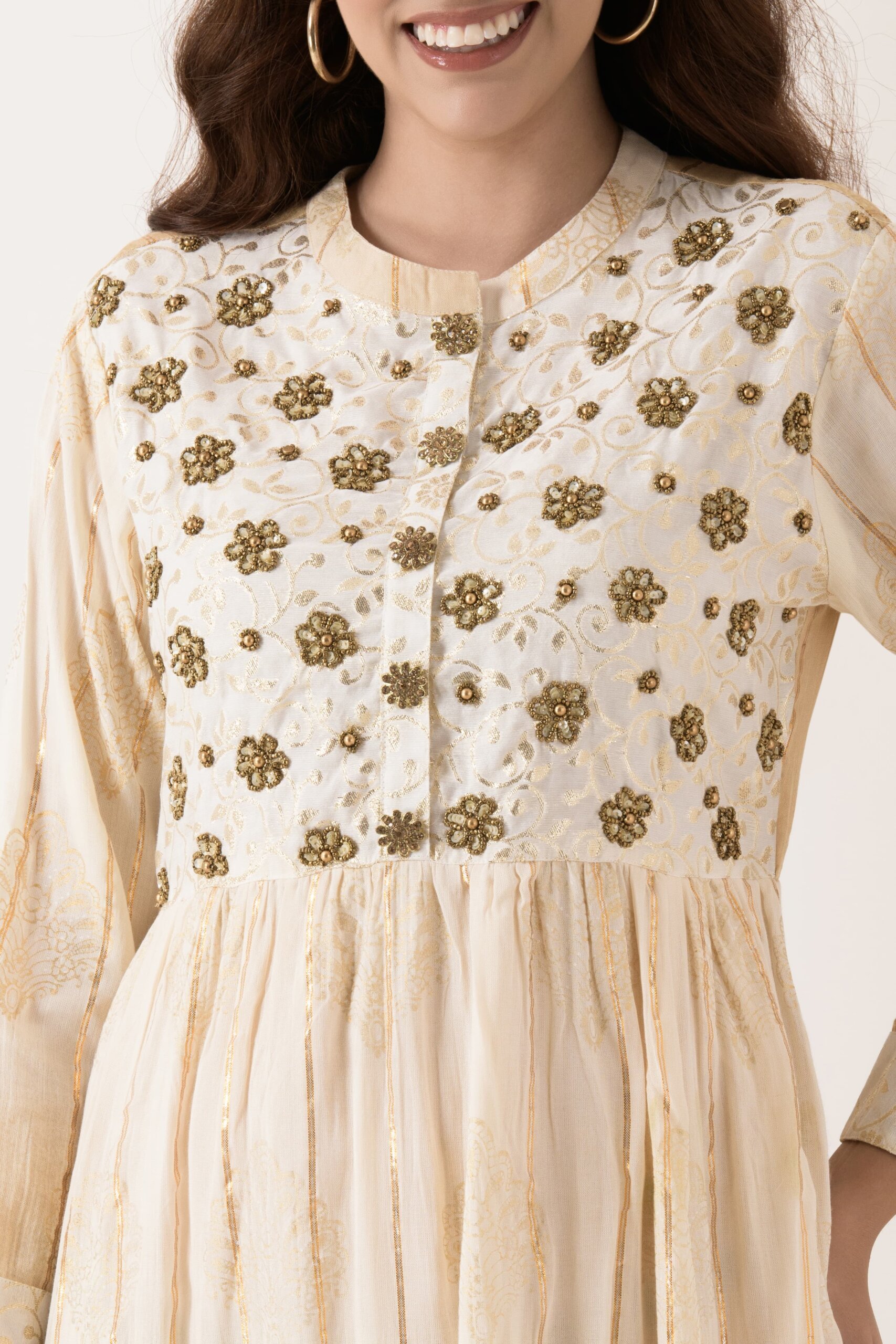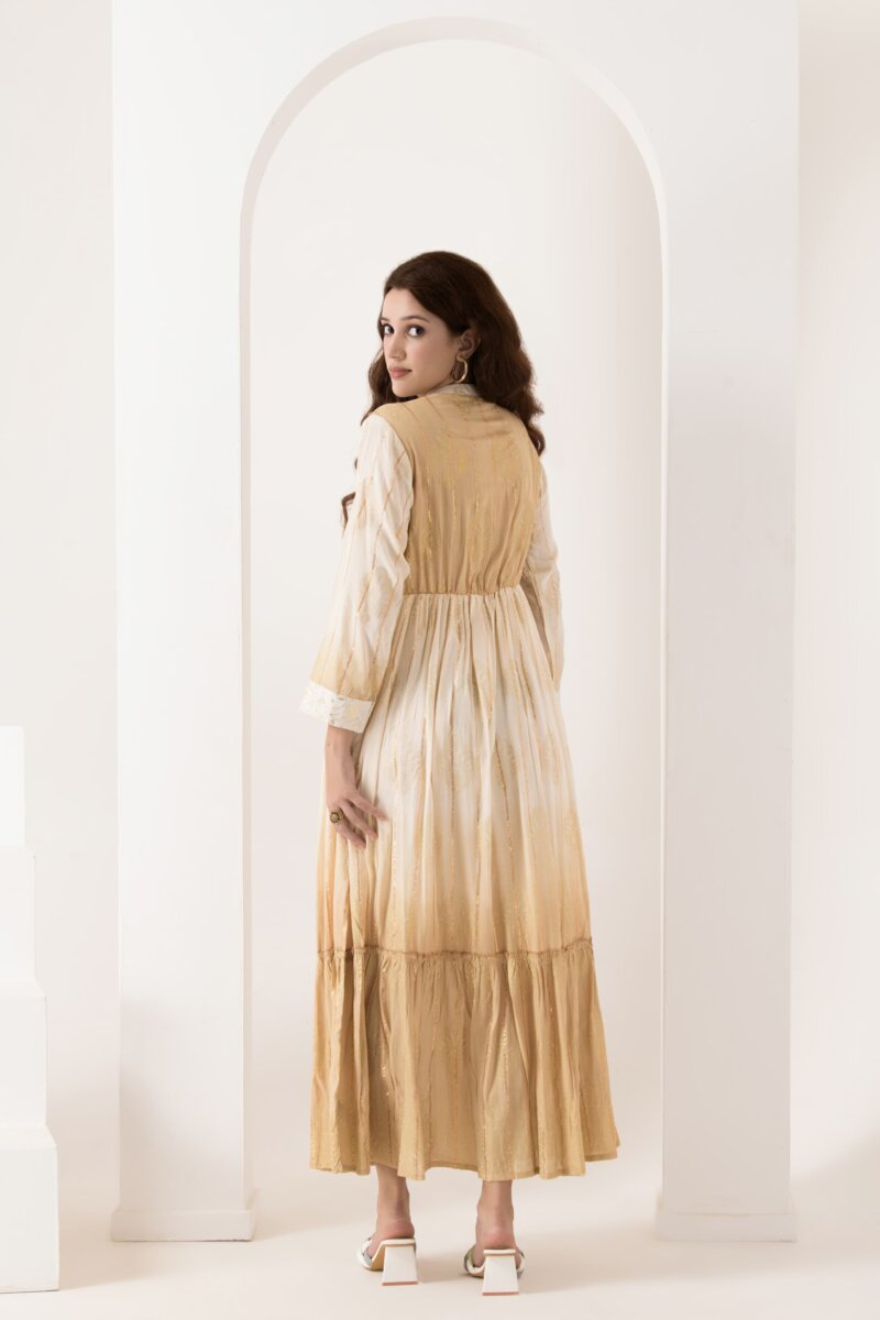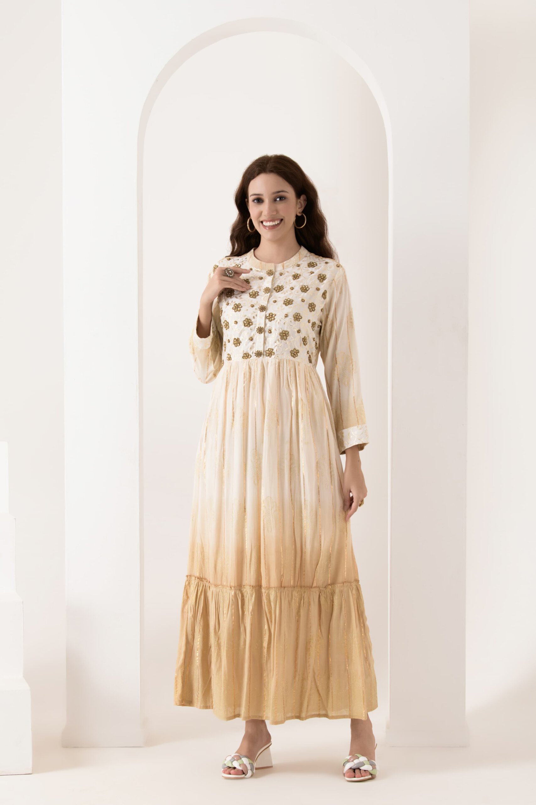 Step into understated elegance with Saraj’s floor-length A-line dress, thoughtfully tailored for everyday ease and quiet luxury. Crafted from breathable premium rayon, this dress features our signature placement prints, exclusively designed in-house to celebrate artistry and individuality. Each print is elevated with delicate handwork, adding a touch of finesse to the subtle, earthy tones of the dusty colour chart—perfect for resort getaways, office meetings, or polished every day wear. The A-line silhouette flows gracefully, while the choice of round or V-necklines and full sleeves ensures comfort and modesty without compromising on style. Available in XL to 4XL, this dress is tailored for women who seek effortless style with a sense of individuality.