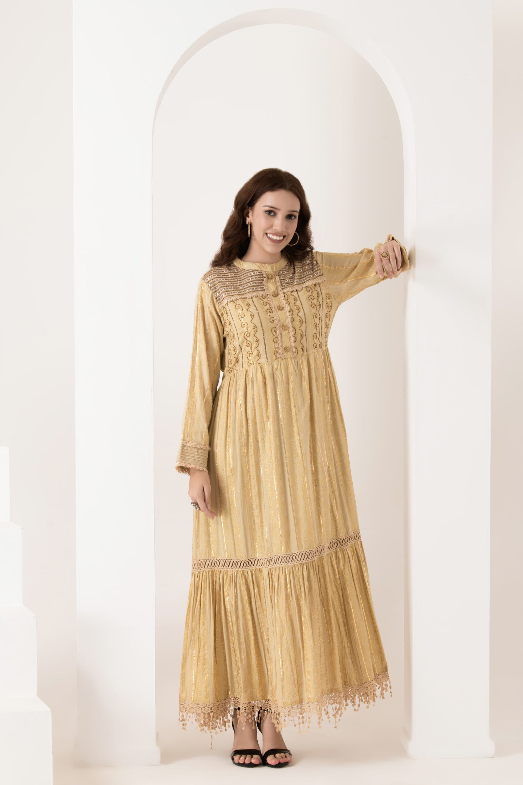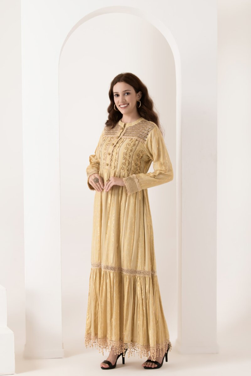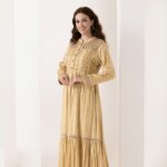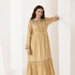 Step into understated elegance with Saraj’s floor-length A-line dress, thoughtfully tailored for everyday ease and quiet luxury. Crafted from breathable premium rayon, this dress features our signature placement prints, exclusively designed in-house to celebrate artistry and individuality. Each print is elevated with delicate handwork, adding a touch of finesse to the subtle, earthy tones of the dusty colour chart—perfect for resort getaways, office meetings, or polished every day wear. The A-line silhouette flows gracefully, while the choice of round or V-necklines and full sleeves ensures comfort and modesty without compromising on style. Available in XL to 4XL, this dress is tailored for women who seek effortless style with a sense of individuality.
