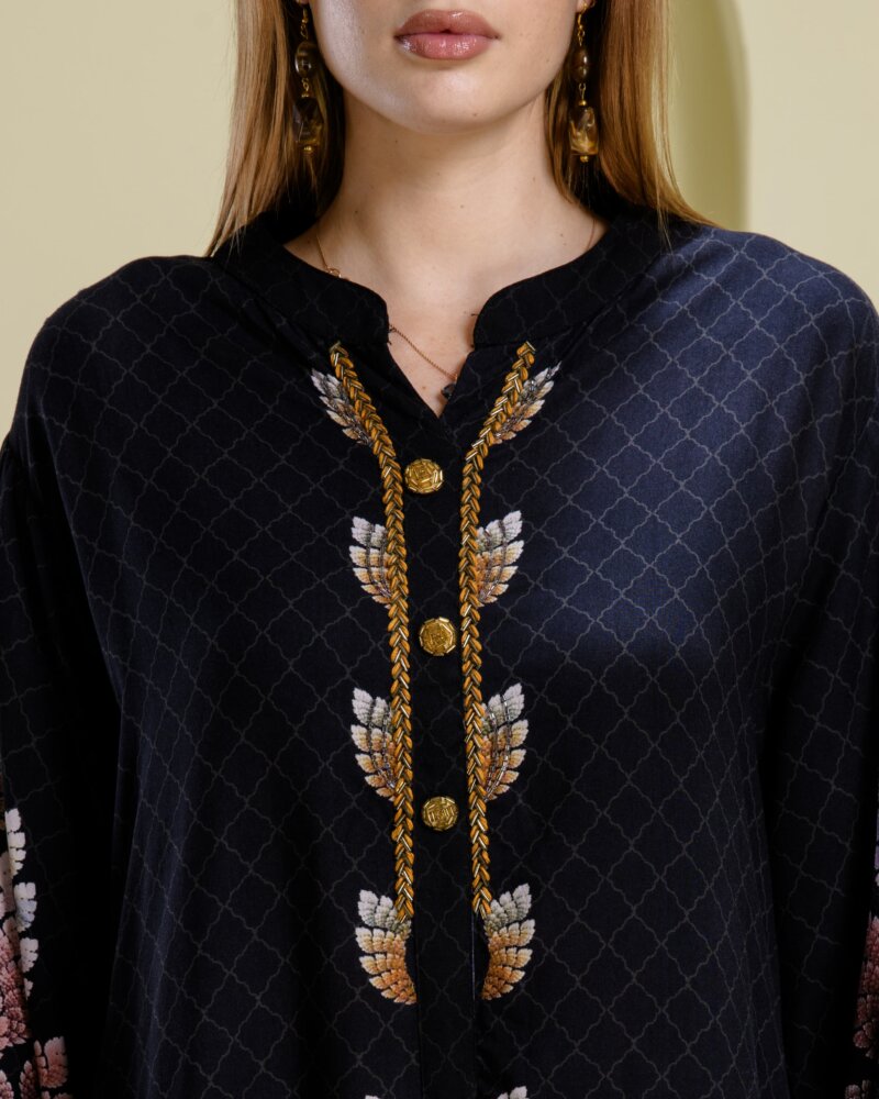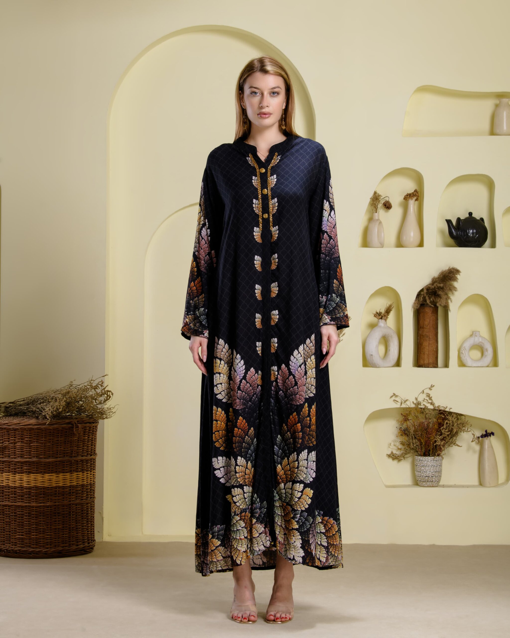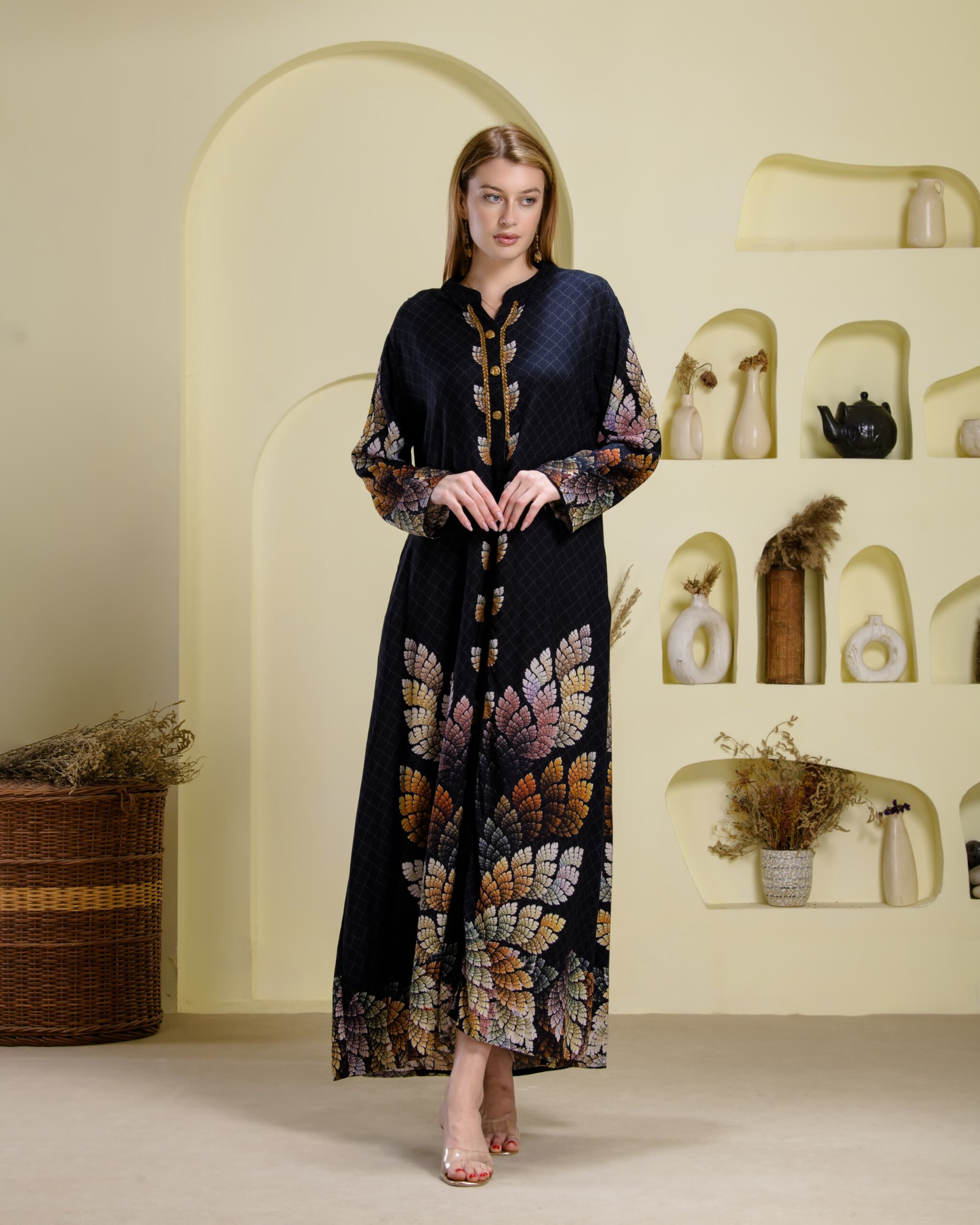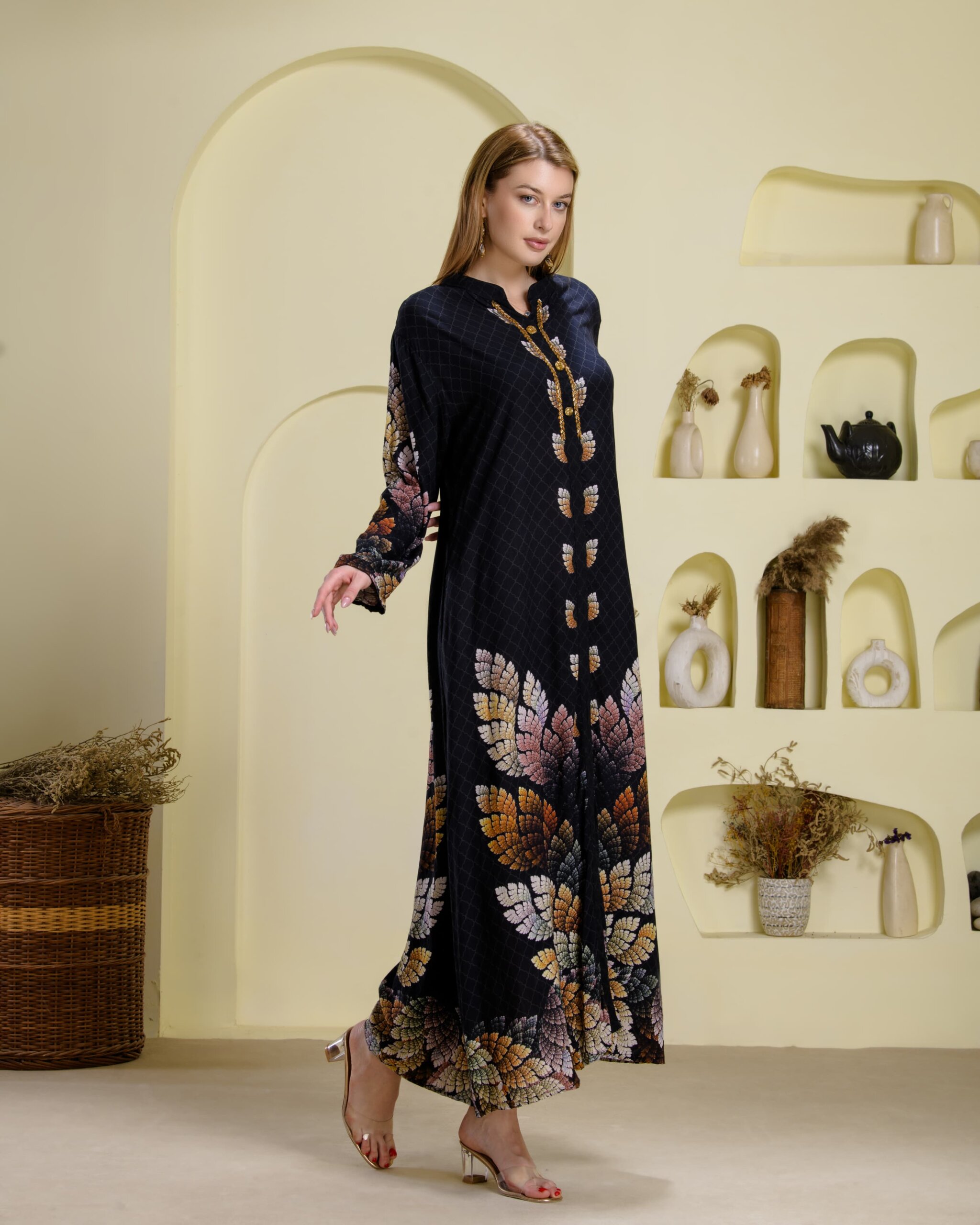 Crafted from breathable premium rayon, this dress features our signature placement prints, exclusively designed in-house to celebrate artistry and individuality. Each print is elevated with delicate handwork, adding a touch of finesse to the subtle, earthy tones of the dusty colour chart—perfect for resort getaways, office meetings, or polished everyday wear. The A-line silhouette flows gracefully, while the choice of round or V-necklines and full sleeves ensures comfort and modesty without compromising on style. Available in XL to 4XL, this dress is tailored for women who seek effortless style with a sense of individuality.
