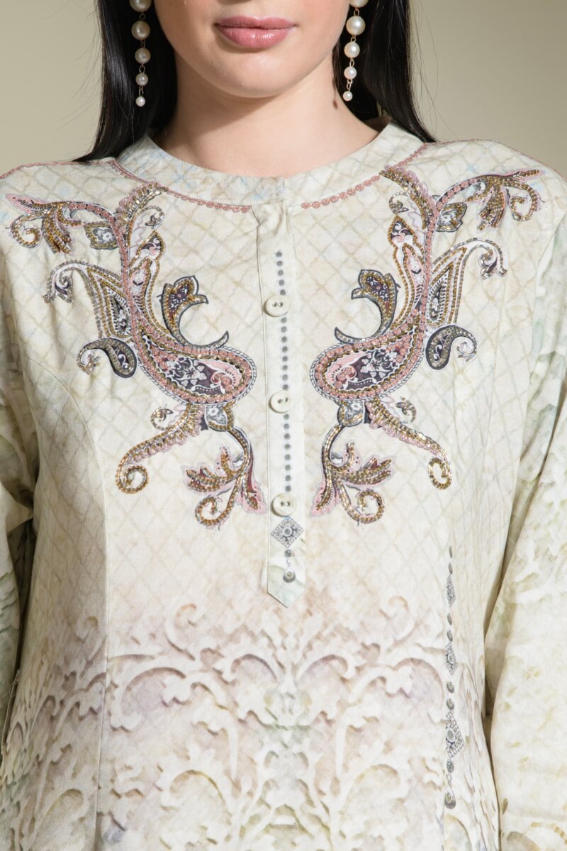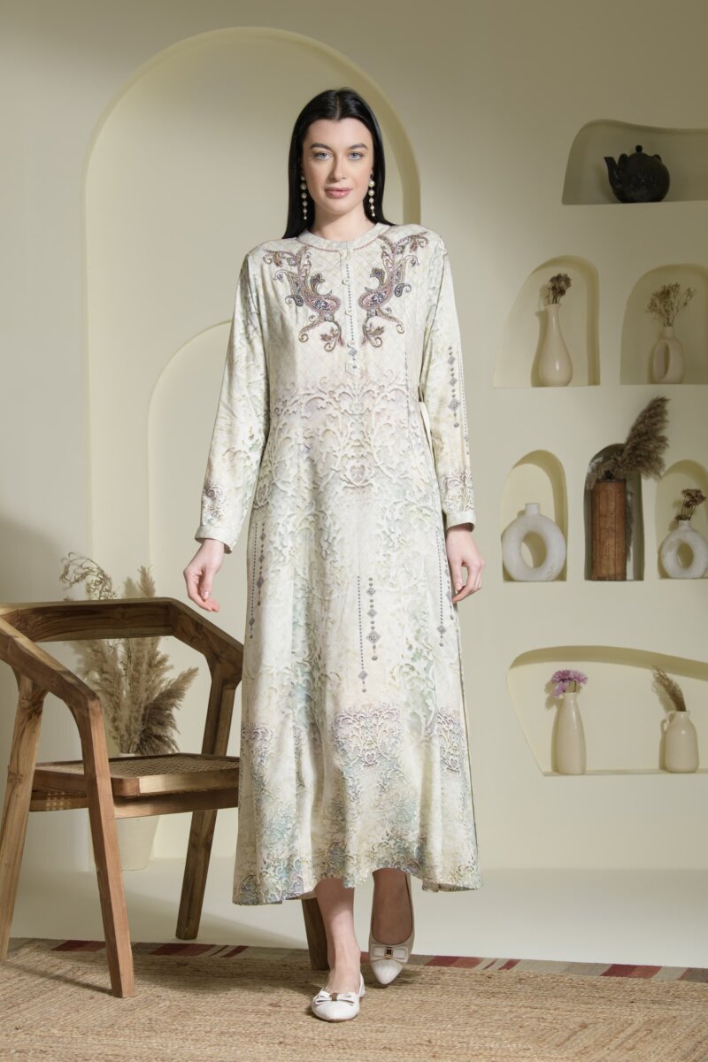 Crafted from breathable premium rayon, this dress features our signature placement prints, exclusively designed in-house to celebrate artistry and individuality. Each print is elevated with delicate handwork, adding a touch of finesse to the subtle, earthy tones of the dusty color chart—perfect for resort getaways, office meetings, or polished every day wear. The A-line silhouette flows gracefully, while the choice of round or V-necklines and full sleeves ensures comfort and modesty without compromising on style. Available in XL to 4XL, this dress is tailored for women who seek effortless style with a sense of individuality.