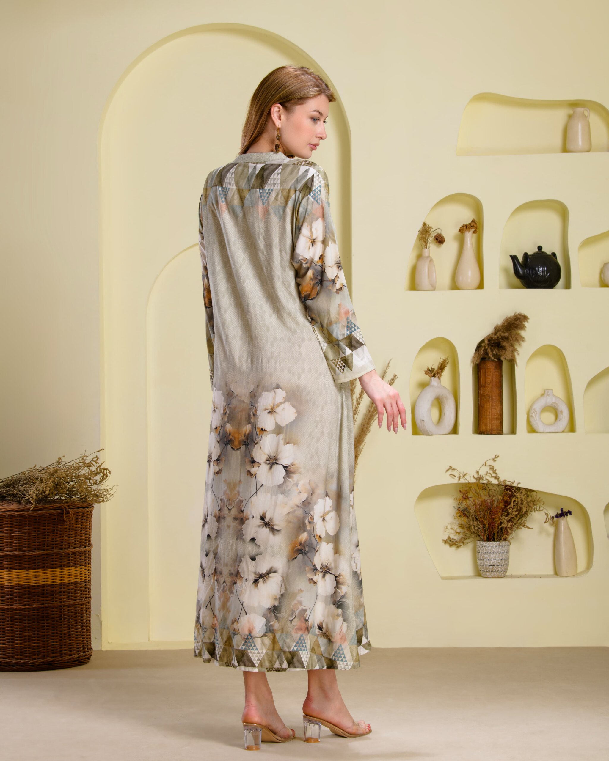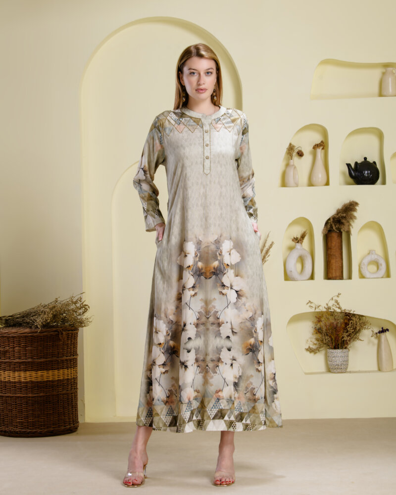 Step into understated elegance with Saraj’s floor-length A-line dress, thoughtfully tailored for everyday ease and quiet luxury. Crafted from breathable premium rayon, this dress features our signature placement prints, exclusively designed in-house to celebrate artistry and individuality. Each print is elevated with delicate handwork, adding a touch of finesse to the subtle, earthy tones of the dusty color chart—perfect for resort getaways, office meetings, or polished every day wear. The A-line silhouette flows gracefully, while the choice of round or V-necklines and full sleeves ensures comfort and modesty without compromising on style. Available in XL to 4XL, this dress is tailored for worn.