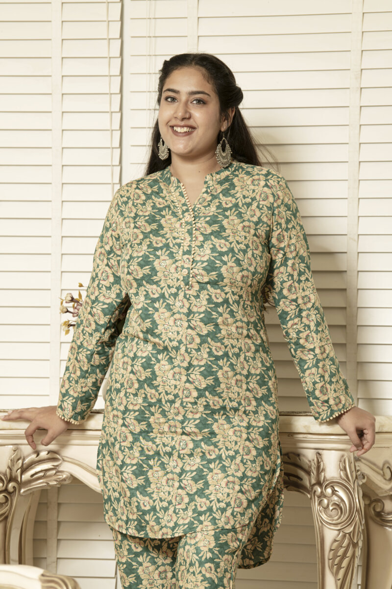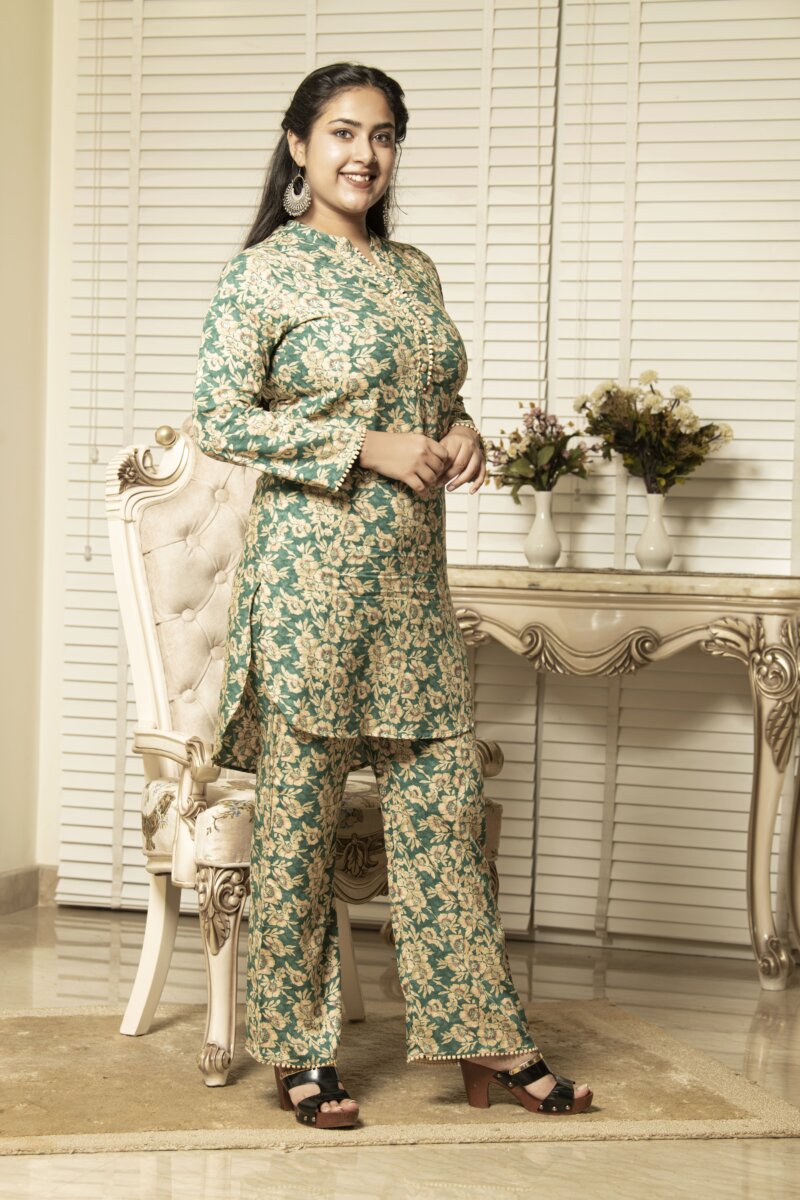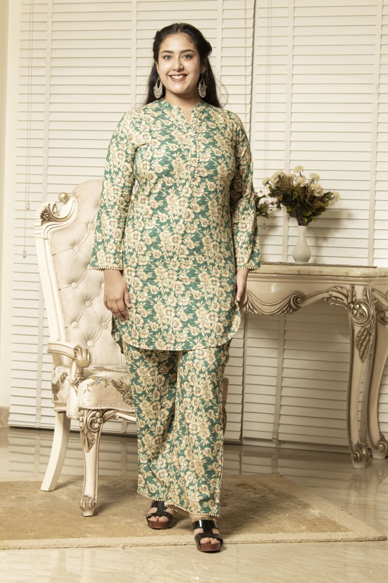 This co-ord set celebrates the beauty and luxury of nature This garment is made for a captivating and timeless outfit that easily mixes traditional and modern styles.
