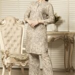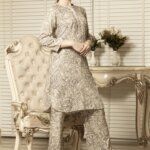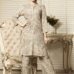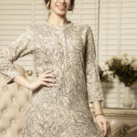 This is a festival honoring the aesthetic legacy of handicraft and the splendor of nature. Grey serves as a neutral backdrop for the sumptuous gold foil and embroidery, which are set out by the entrancing Ambi print.
