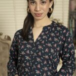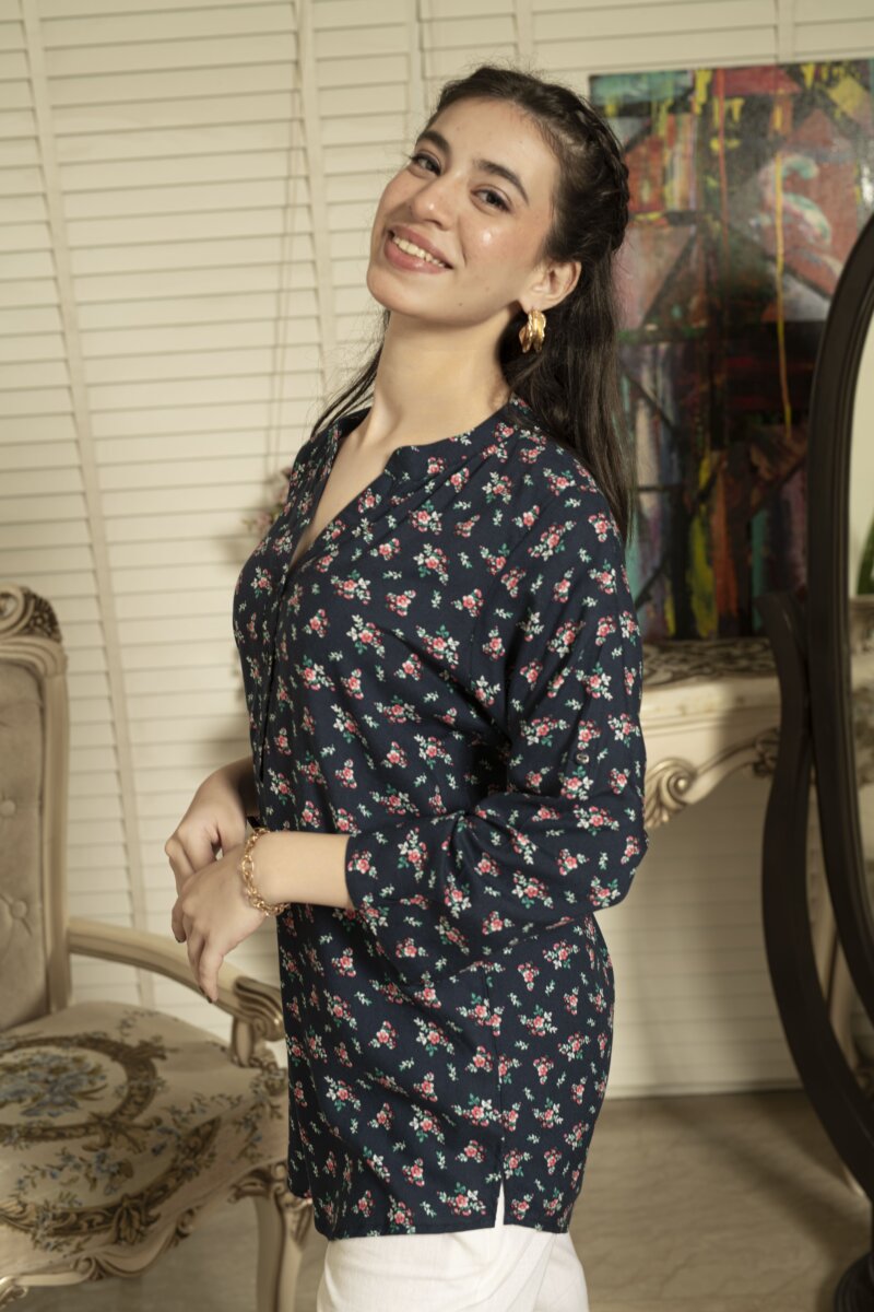 A sophisticated and adaptable design statement, The Dark Blue Tunic with Delicate Pink Floral Accents flawlessly combines classic features with a dash of modernism.
