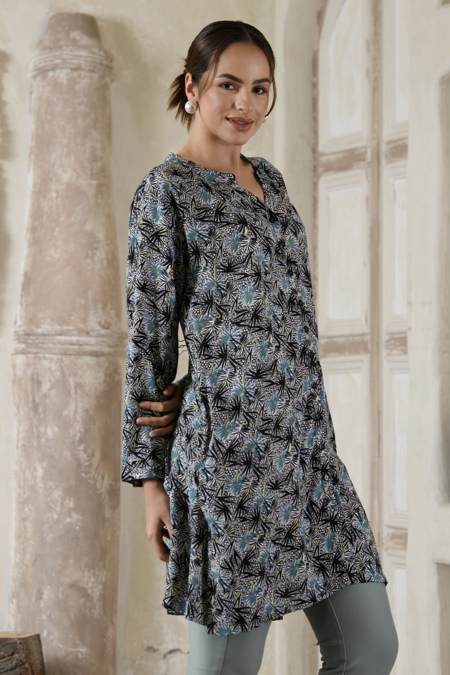 Made for comfort, styled with elegance—this big-size mama shirt from Saraj is designed in premium rayon to keep you cool and confident throughout the day. The 36–37 inch length offers full coverage with a stylish, easy-going silhouette.
