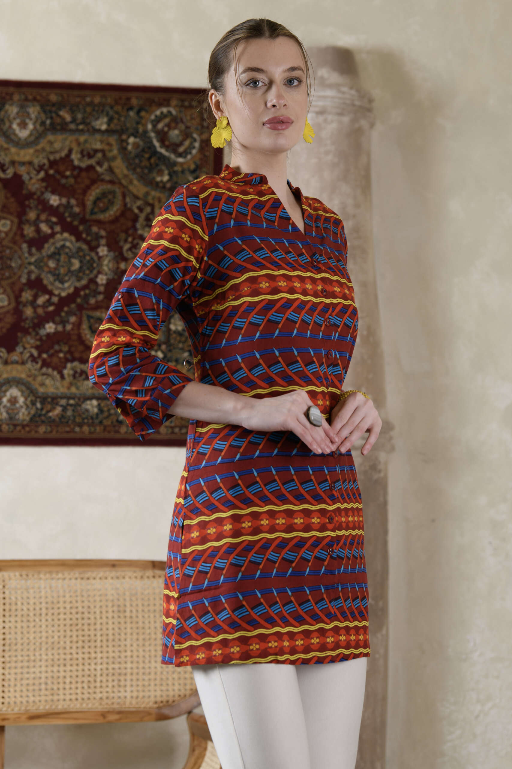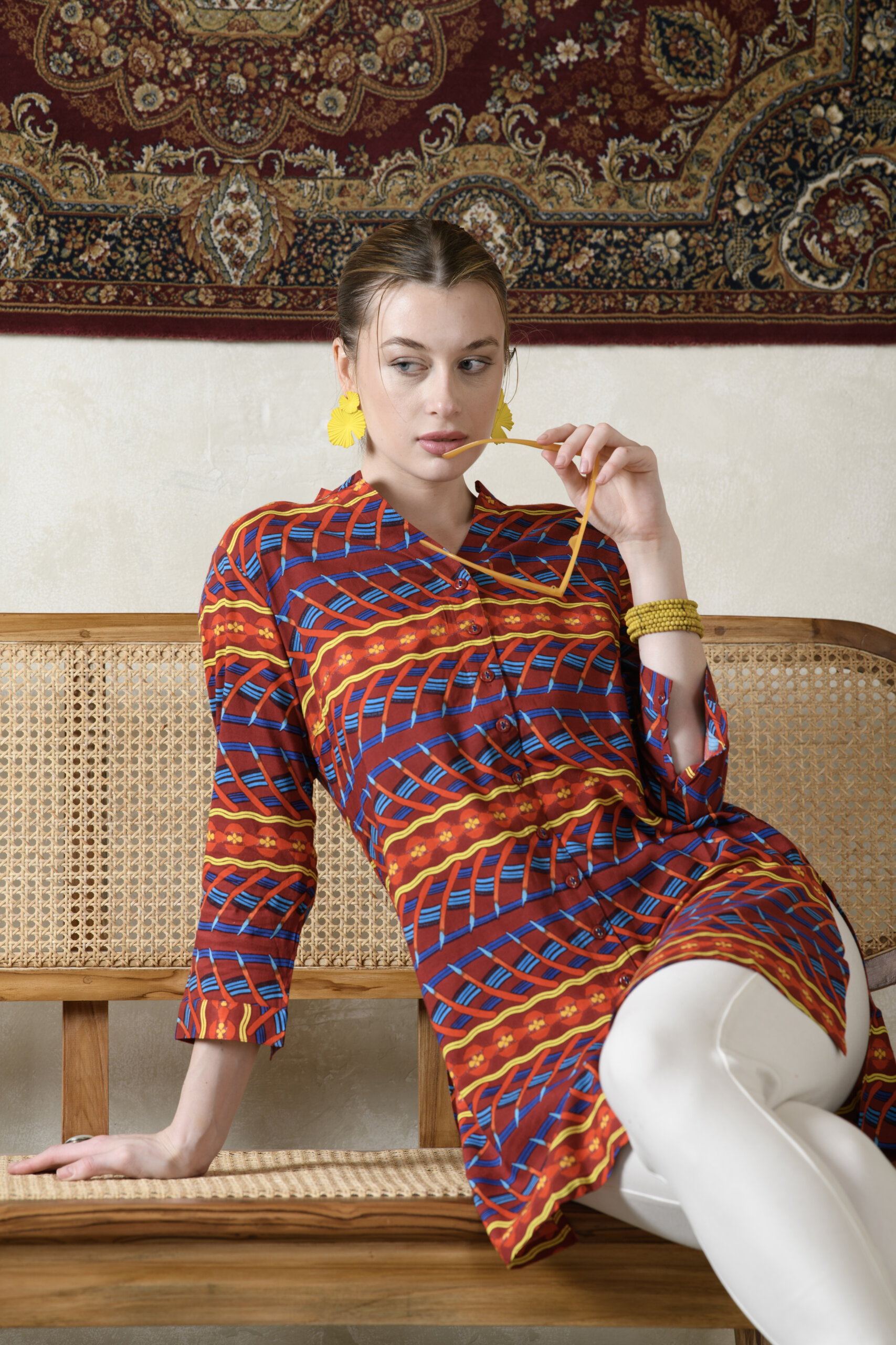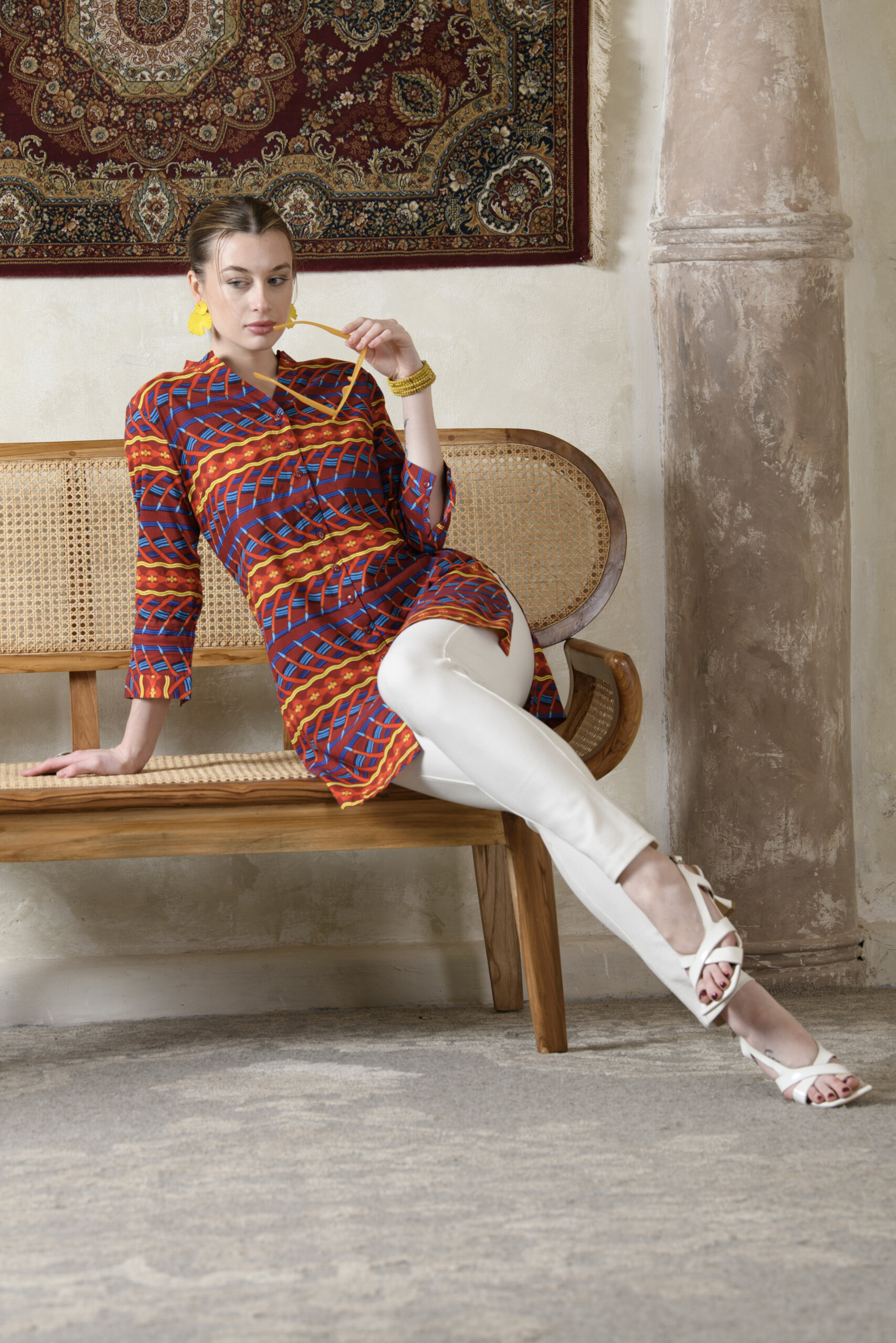 This tunic features Saraj’s exclusive prints, bringing out the vibrancy and beauty of Indian ethnic design in a modern way. The flattering silhouette drapes beautifully, while the precise stitching and clean finish speak volumes about Saraj’s export-quality standards.